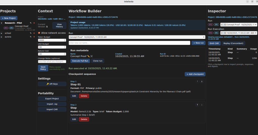 Intelexta is the professional IDE that empowers responsible AI creation. It’s where we enforce our core principle for professional work: “Proof, not vibes.” It brings rigor and mastery to the R&D workflow, making it auditable, cost-aware, and energy-efficient.